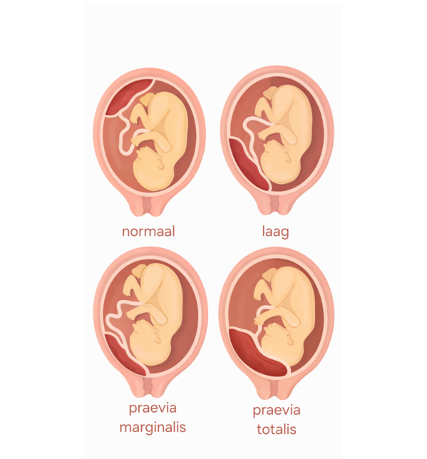 Als de placenta bij de 20 weken laag lag, wordt bij 32 weken opnieuw een echo gemaakt om te beoordelen waar de placenta ligt. De placenta zit vastgegroeid tegen de binnenkant van je baarmoeder en is ongeveer 15cm in diameter. De placenta kan overal tegen je baarmoeder zijn gegroeid; daar waar deze zich in het begin heeft genesteld. Meestal maakt het niks uit. Je kunt je voorstellen dat het wel een probleem vormt als de placenta over de baarmoedermond heen ligt, of daar heel dichtbij. De placenta blokkeert dan de ‘natuurlijke uitgang’ voor de baby. We noemen een voorliggende placenta in medische termen ook wel een placenta praevia. Een vaginale bevalling is dan niet mogelijk. Wanneer de placenta er niet voor ligt, maar wel vlakbij, dan is vaginaal bevallen soms wel mogelijk. Dit is afhankelijk van hoe dicht de placenta bij de uitgang van je baarmoeder ligt. Het is dus heel belangrijk dit te controleren, als de placenta bij de 20 weken echo laag lag. De reden dat het pas bij 32 weken definitief wordt beoordeeld is omdat de baarmoeder in de tussentijd natuurlijk nog enorm gegroeid is. De placenta (die vastzit aan de wand), groeit mee omhoog. Soms is het daarom zo dat er bij 20 weken twijfel is, maar dat bij 32 weken zwangerschap wordt gezien dat de placenta hoog genoeg ligt. Lag de placenta bij 20 weken volledig over de baarmoedermond heen, dan zal dit niet meer veranderen. De kans op bloedverlies tijdens je zwangerschap is dan ook groot. Dit kan je je voorstellen, want de placenta kan zich op de baarmoedermond niet goed hechten, dus daar kan gemakkelijk wat bloed uit sijpelen. Om die reden heb je meer kans op herhaaldelijk bloedverlies en weet je vaak al eerder of er sprake is van een voorliggende placenta.